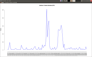 Die X-Achse zeigt den Zeitpunkt im Stundenintervall, die Y-Achse die Anzahl der Tweets. Vor Beginn des Camps ist der Graph insofern lückenhaft, als dass er nicht alle Zeiträume der Inaktivität anzeigt.
