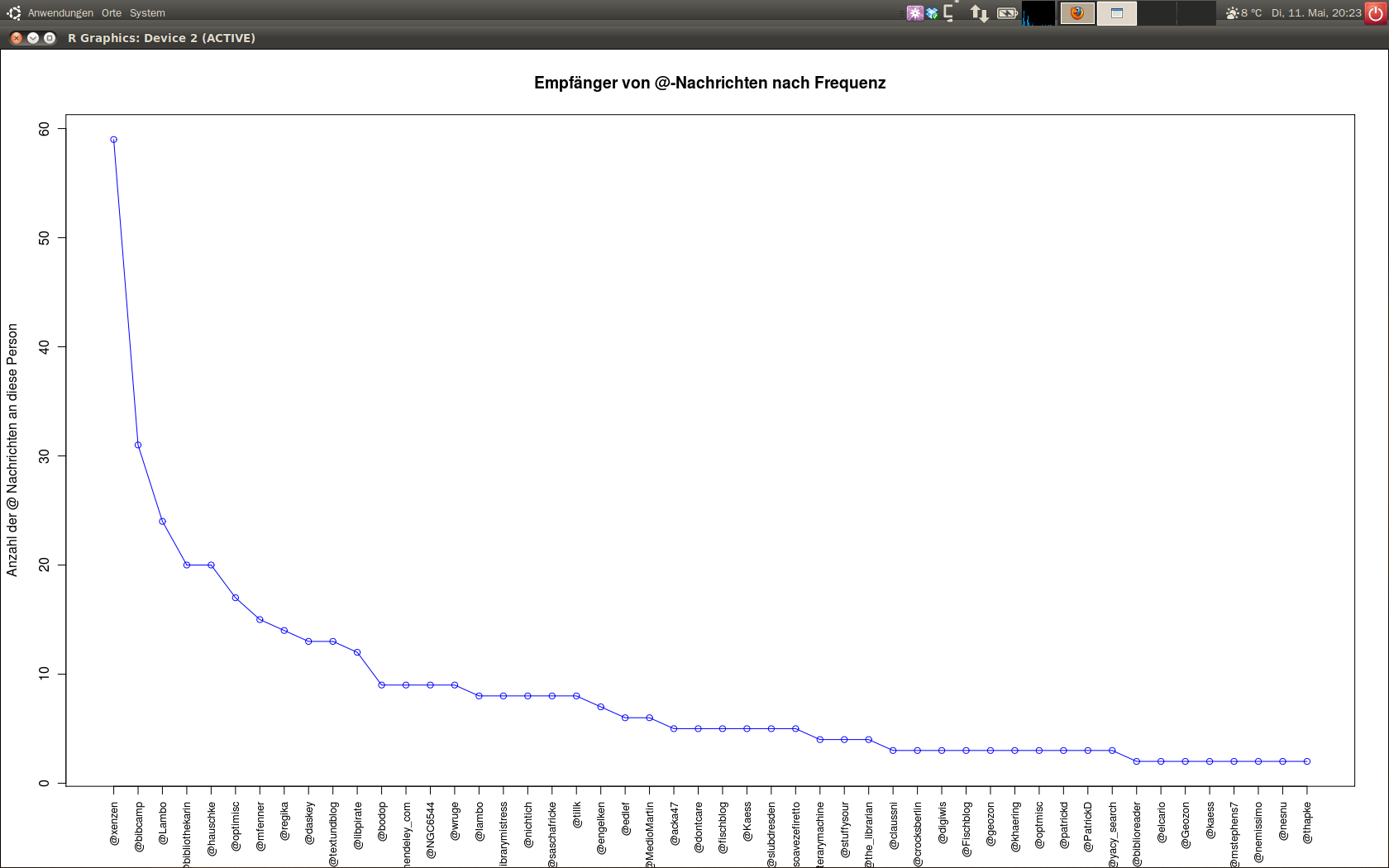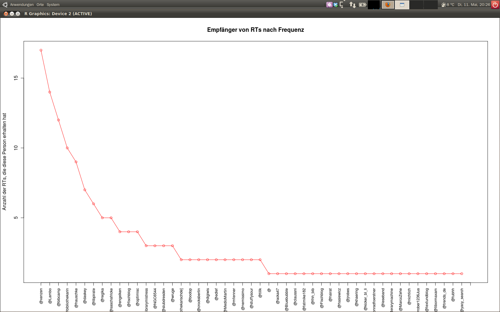 Wieder zeigt die X-Achse die Benutzernamen, die Y-Achse die Anzahl der RTs. Wieder liegt Anne Christense vorne, wobei man bedenken muss, dass die oben gezeigten @-Messages bereits die RTs enthalten (ein Chart mit beiden Frequenzen wäre sinnvoll gewesen, aber mir fehlte die Zeit). Das Maximum liegt bei 17, der Mittelwert bei 3,1 (152 RTs an 49 Nutzer).