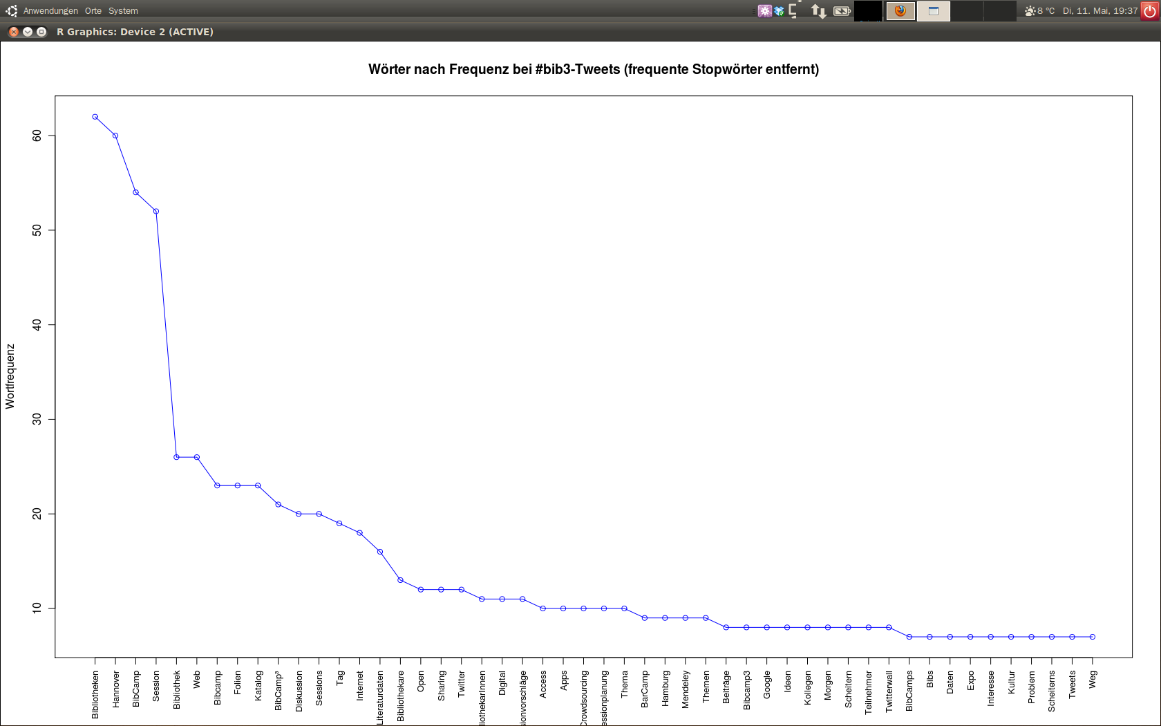 Ich habe für das BibCamp³ in Hannover (7.-8. Mai) einmal die Gelegenheit ergriffen, einige von mir entwickelte Twitter-Scripte für Konferenzen auszuprobieren. Eine sehr ähnliche (und noch etwas hübscher aufbereitete) Auswertung gibt es hier. Die „Ergebnisse“ sind bislang noch nicht besonders aufregend, aber ich wollte sie für die Teilnehmer und andere Interessenten trotzdem hier posten.
