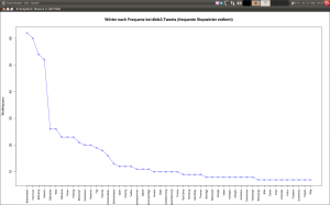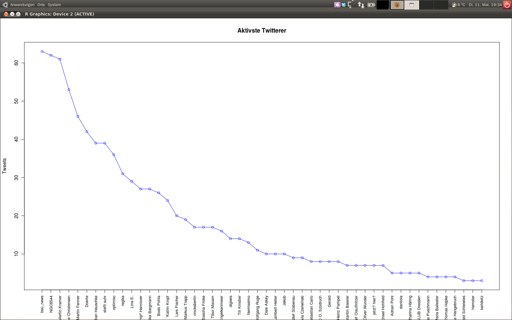 Die X-Achse zeigt in dieser Darstellung die Namen der User sofern angegeben (nicht den @-Usernamen), die Y-Achse wieder die Anzahl der Tweets (Maxium: 63). Da der Graph nur die Top 50 von 114 darstellt, ergibt sich eine ziemlich eindeutige „Long Tail“-Distribution, wenn man sich den Verlauf nach rechts weiterdenkt (auch schön zu sehen bei Summarizr). Eine relativ kleine Spitzengruppe (@bsu_news, @NGC6544 und @MedioMartin) vereint eine hohe Zahl von Tweets auf sich, dann fällt es deutlich ab. Der Mittelwert liegt bei 8,8 Tweets.