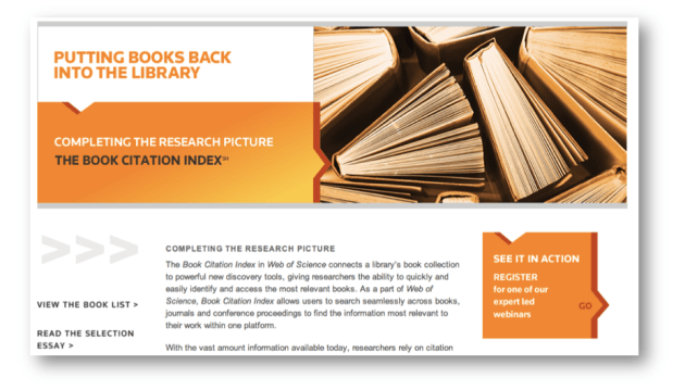 „Der Book Citation Index des Web of Science verbindet die Buchsammlung einer Bibliothek mit einem leistungsfähigen neuen Entdeckungs-Tool, das Forschern die Möglichkeit gibt, schnell und mühelos die wirklich relevanten Bücher ausfindig zu machen und Zugriff darauf zu bekommen. Web of Science vereint wissenschaftliche Bücher, Fachzeitschriften und Konferenzbeiträge, um das enorme Potenzial des Durchsuchens von Zitierungen optimal nutzen zu können. Autoren und Forscher können ab sofort das bestehende Netz an Zitierungen zwischen Büchern und der Forschung allgemein analysieren.“