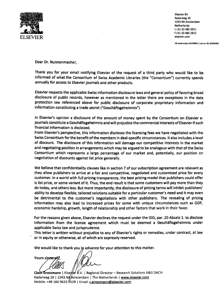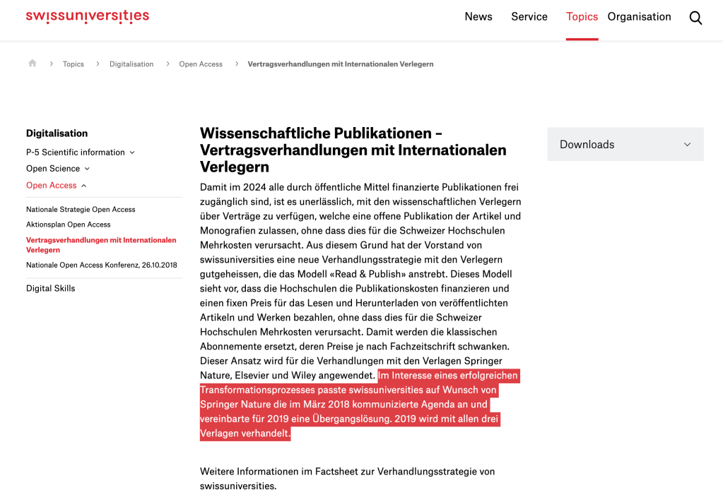 Immerhin hat man bei swissuniversities erkannt, dass man durch den Fokus auf R&P Agreements Gold OA vernachlässigt hat. Vor kurzem wurden nationale Verhandlungen mit reinen Gold OA Verlagen, sowie die Stärkung von institutionellen Gold OA Funds angekündigt. Für Gold OA ist eine Kostenobergrenze von 2500 CHF vorgesehen. Wo war diese Obergrenze als man mit Elsevier den teuersten Schweizer Deal aller Zeiten eingegangen ist?