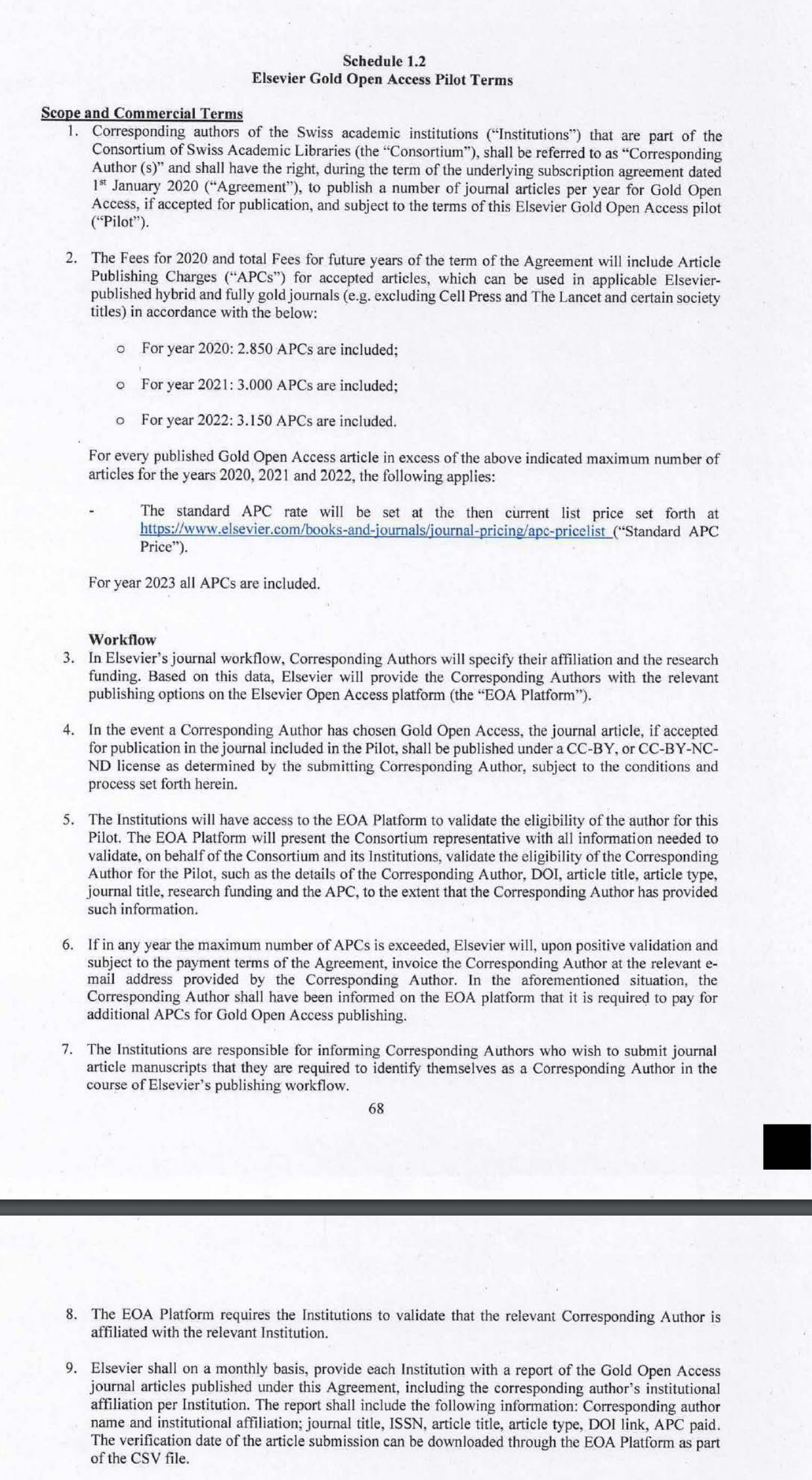 Der Vertrag liest sich zunächst wie ein klassischer Big-Deal für Journal Subskriptionen. Die Schweizer Hochschulen gönnen sich einmal mehr für 4 Jahre Zugriff auf das gesamte Journal-Portfolio von Elsevier. In einem Addendum von anderthalb Seiten wird schliesslich der neue Workflow für OA-Publikationen beschrieben.
