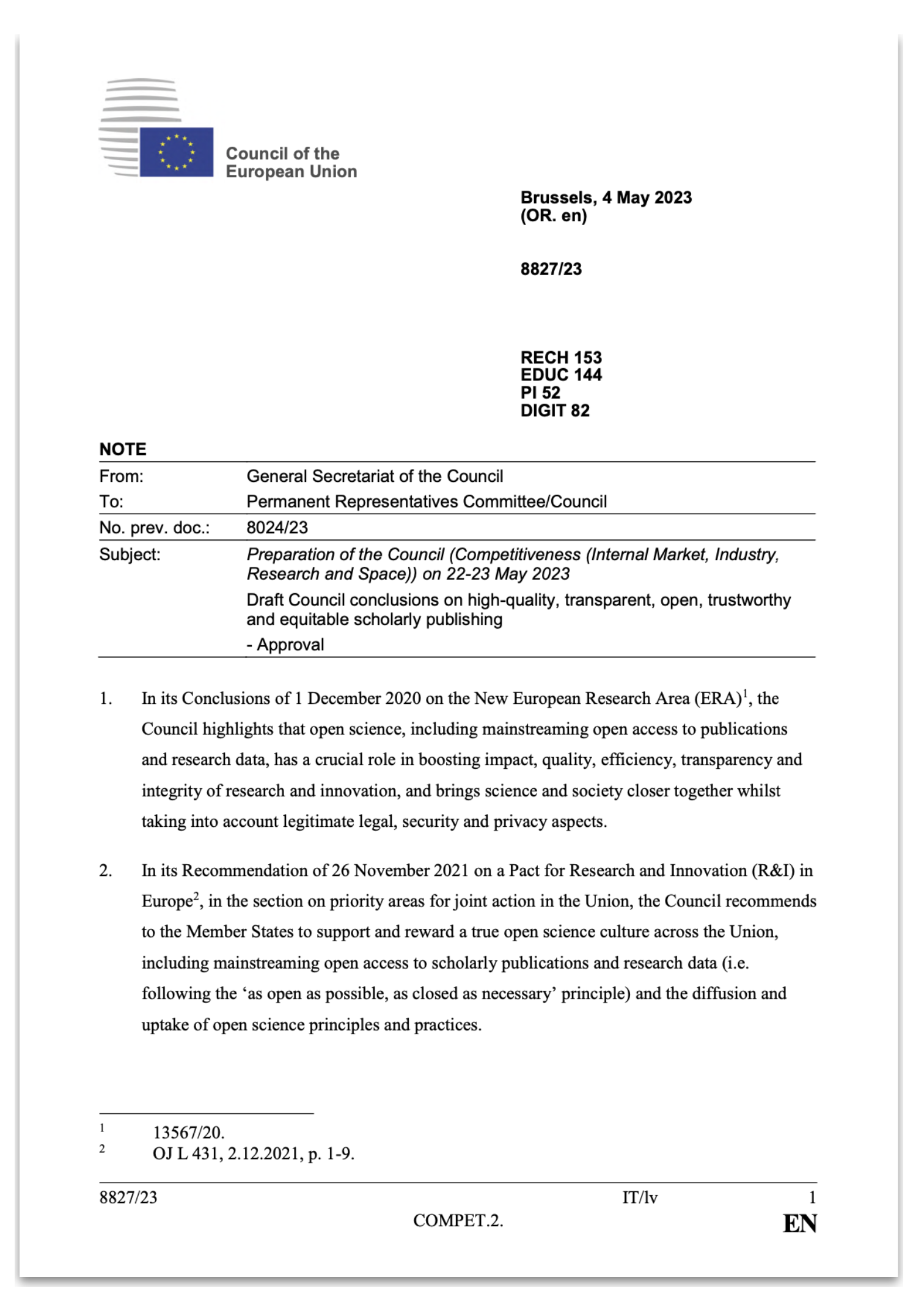 In der jetzt verabschiedeten Version der Schlussfolgerungen die Forderung nach sofortigem Open Access für wissenschaftliche Publikationen, die im Rahmen der öffentlich geförderten Forschung entstehen, nochmals betont. Dieses Ziel wurde bereits 2016 von den EU-Wissenschaftsministerien erhoben. Die Wissenschaftsminister:innen hatten damals einen Open-Access-Anteil von 100 % bis 2020 gefordert. Dieser Wert wurde bisher jedoch nicht erreicht. In Deutschland liegt der Open-Access-Anteil zum Beispiel bei 63 Prozent, während die Niederlande im Publikationsjahr 2021 einen Anteil von 82 Prozent erreichten.