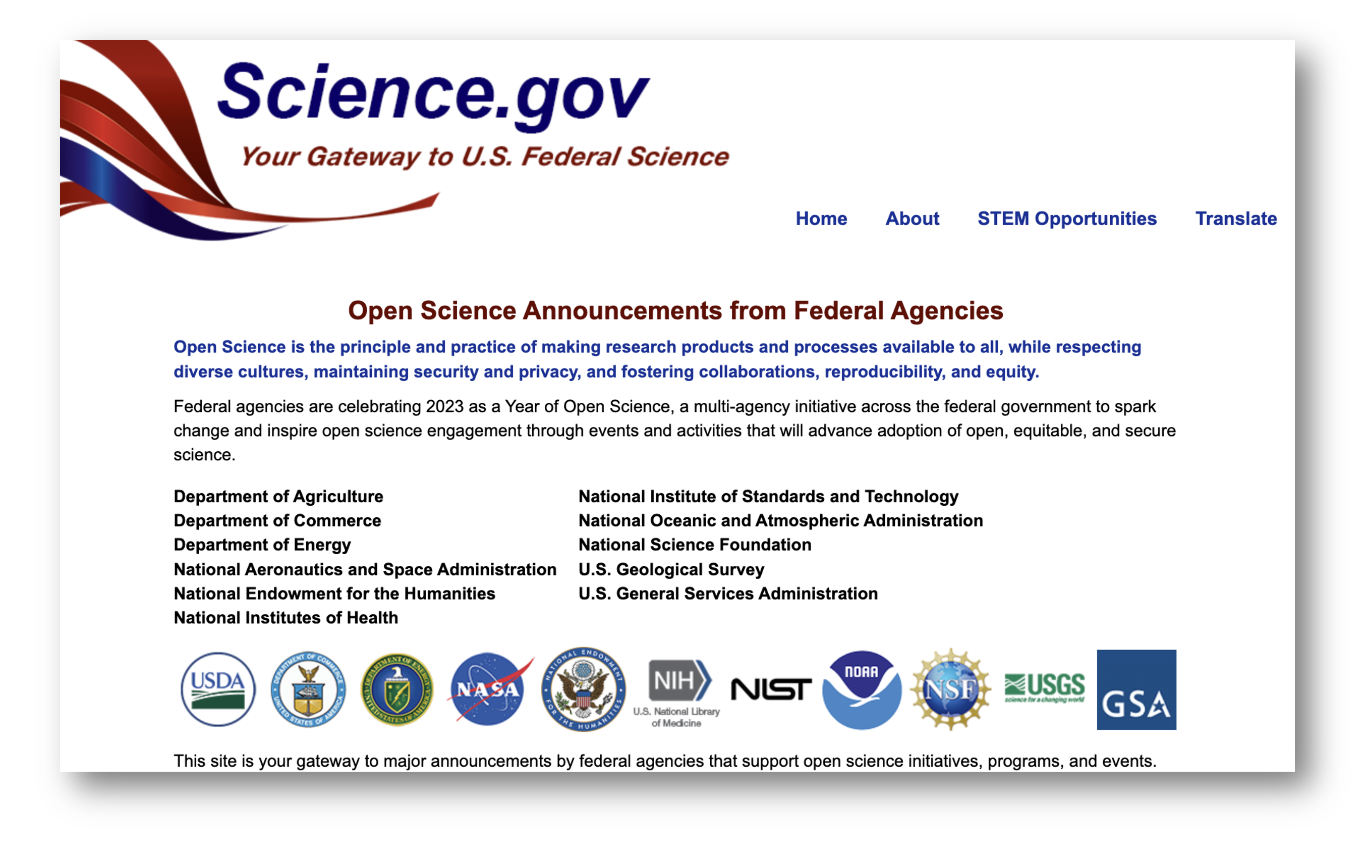 Auf der Webseite open.science.gov werden Informationen zu den Open-Science-Aktivitäten der US-Behörden gesammelt. Über die Webseite steht auch ein zentraler Sucheinstieg zu den Open-Access-Repositorien der Behörden (u.a. NASA, NIH et al.) zur Verfügung.