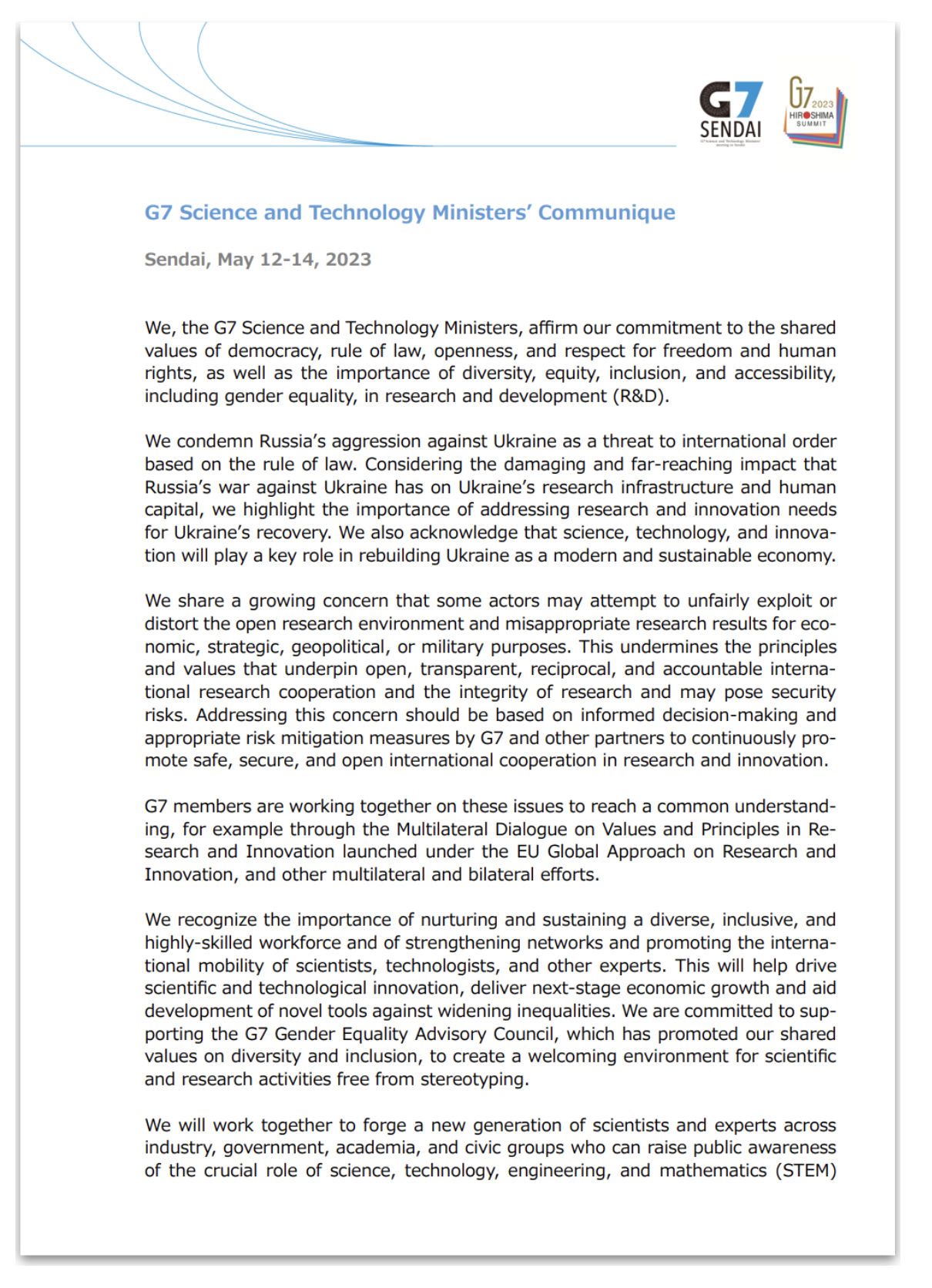 Unter dem Titel „Respect for freedom and inclusiveness in scientific research and promotion of open science“ haben die Wissenschaftsminister:innen der G7-Staaten das Thema Open Science auf ihrer jüngsten Sitzung in Sendai, Japan, vom 12. bis 14. Mai 2023 behandelt.